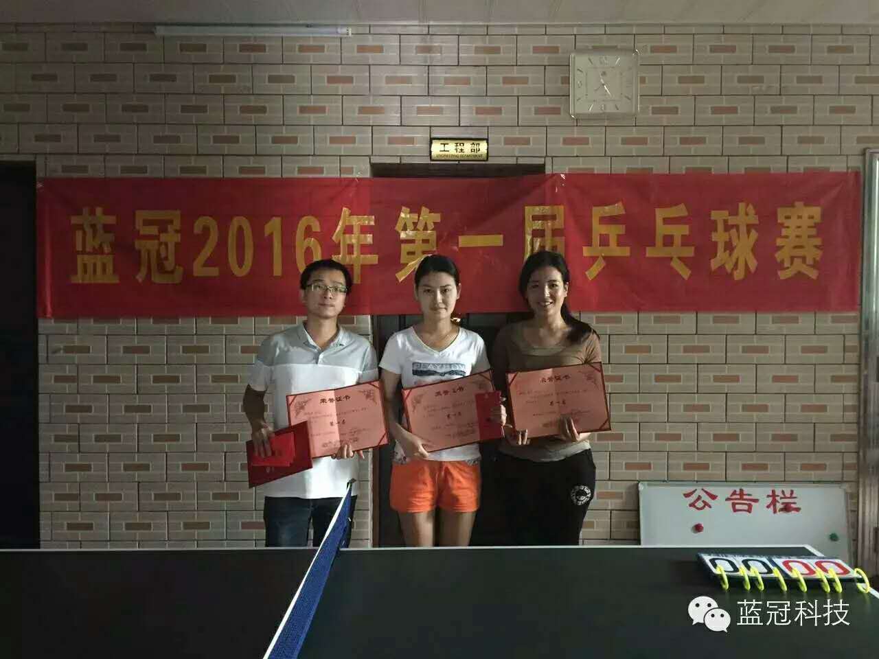 迎新辭舊,藍冠第一屆乒乓球賽2016年1月15日-17日在藍冠公司隆重舉行,經過幾輪精彩激烈的對戰,陳家軍、鄧琳、苗瓊分別獲得單打、雙打各項冠軍。