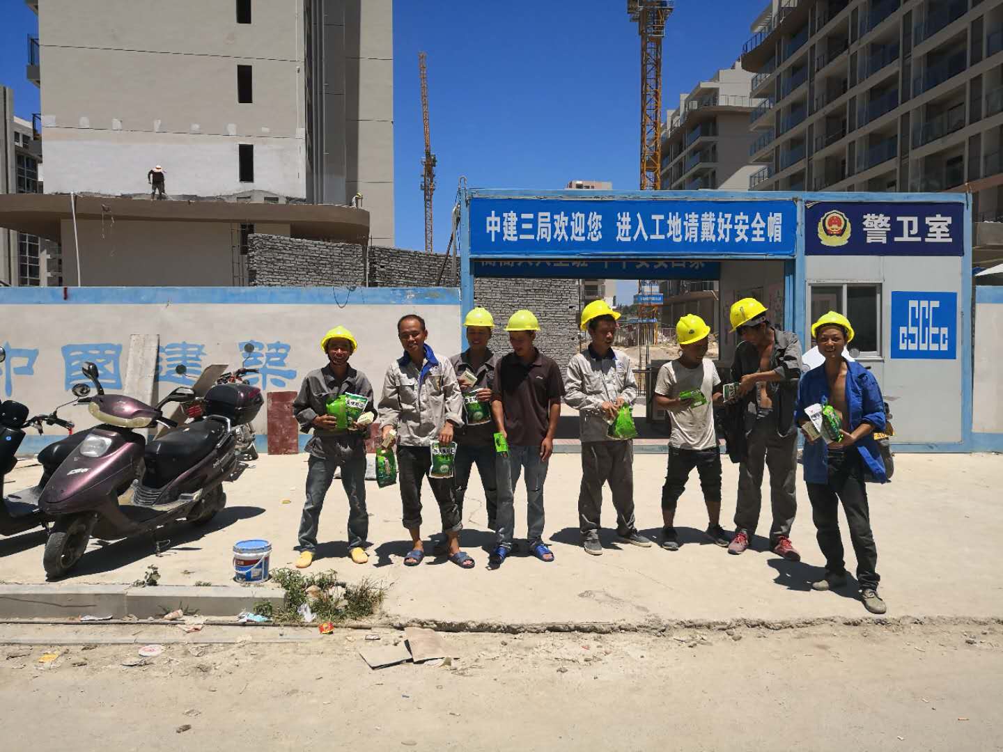 六月炎熱夏日,藍冠總經理霍海東慰問三亞紅塘灣項目、海口美麗沙項目的一線施工人員,并給予每一位施工人員發放了降溫降暑禮品。