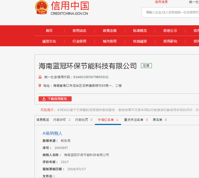 祝賀“海南藍冠”榮獲“信用中國”2017年守信紅名單
